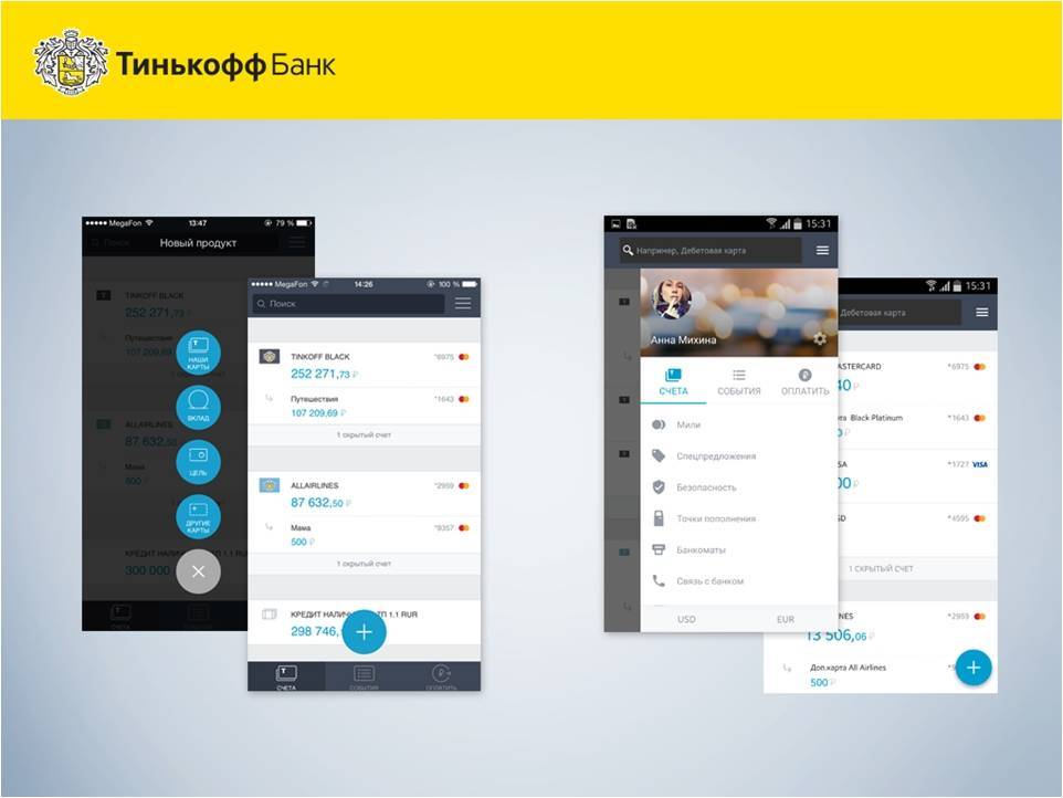 По дебетовым картам Тинькофф Банка доступен весь стандартный функционал – снятие наличных, пополнение, внутренние и внешние банковские переводы, любые оплаты. Клиенты бесплатно пользуются эргономичными интернет-банком и мобильным приложением.