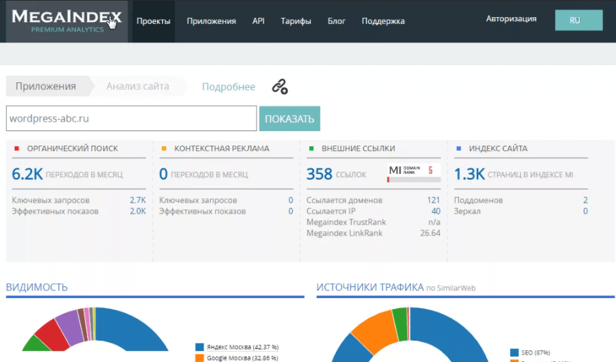 В платной версии сервис проверяет историю видимости в Яндексе и Google, анализирует конкурентов, снимает позиции до ТОП-20. Есть удобный генератор отчетов, в котором можно задать свой логотип и копирайты.