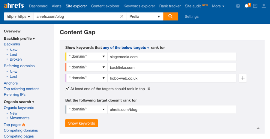 В Сайт Эксплорере Ahrefs существует удобный отчет по упущенной семантике.