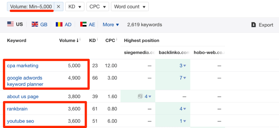 Также я установлю фильтр по частотности, чтобы видеть ключевые слова с максимальной частотностью не больше 5000.