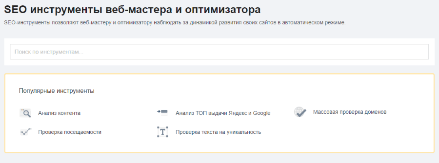 В SeoLik больше 100 разнонаправленных инструментов. Например, можно определить возраст домена или аффилированность сайтов, проанализировать ссылки из соцсетей, проверить, нет ли страниц в реестре запрещенных ресурсов РКН.