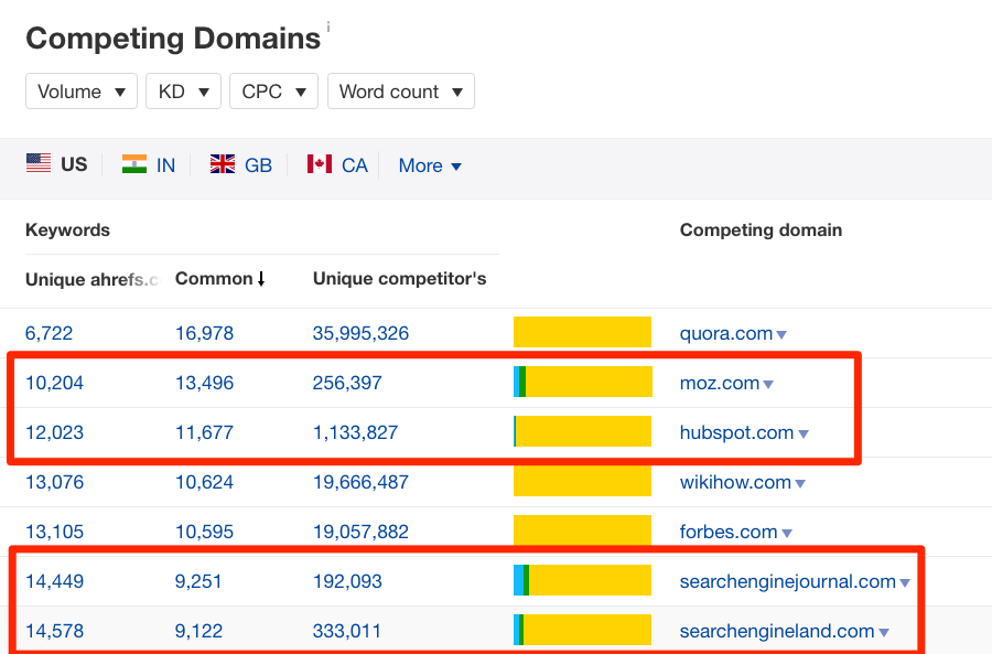 Я просмотрел отчёт «Домены-конкуренты» для блога Ahrefs и выбрал три сайта, которые я считаю главными конкурентами.