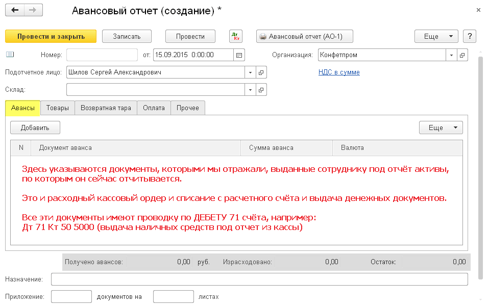 Так вот, чтобы напечатать такой отчёт (АО-1), списать с сотрудника задолженность по 71 счёту, а также принять расходы в тройке существует документ “Авансовый отчет”: