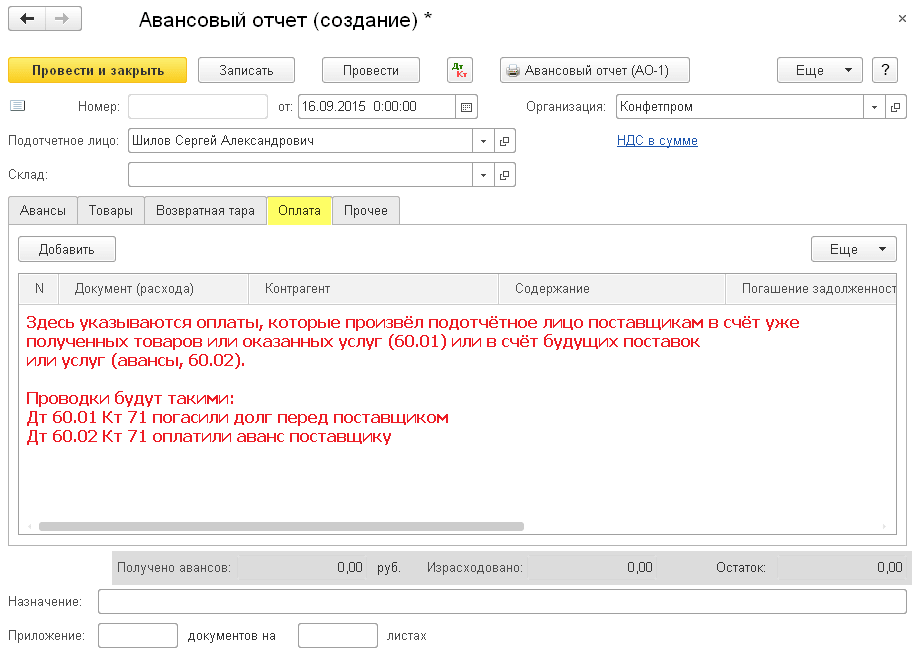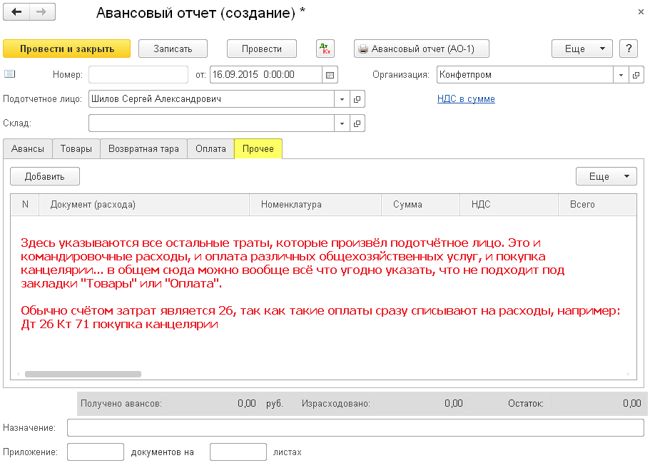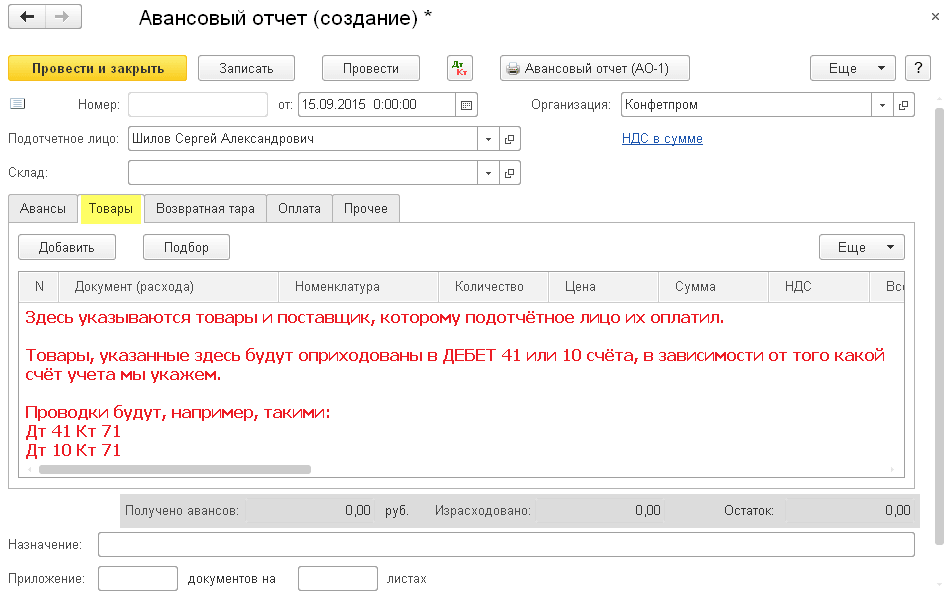 Рассмотрим подробнее на примере как заполнить авансовый отчет.