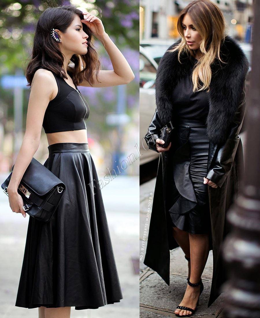 Несомненно, подобный look выделит девушку из толпы, уж очень он экстравагантный. Однако проявление оригинальности и индивидуальности в стиле сегодня в моде. Поэтому дерзайте и не останавливайтесь на популярных фасонах. Существует множество вариантов кожаных юбок: длинные в пол, миди, с асимметричным низом, разрезами, перфорацией, плиссировкой, декоративными шнурками, украшениями…