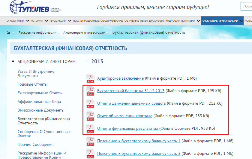 Формы финансовой (бухгалтерской) отчетности ОАО «Туполев» на сайте компании