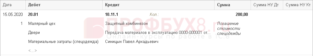 | Передана спецодежда в эксплуатацию | 10 «Спецодежда в эксплуатации» | 10 «Спецодежда на складе» | 4 130 руб. =1 290 × 1 + 320 × 1 + 130 × 12 + 960 × 1 | |