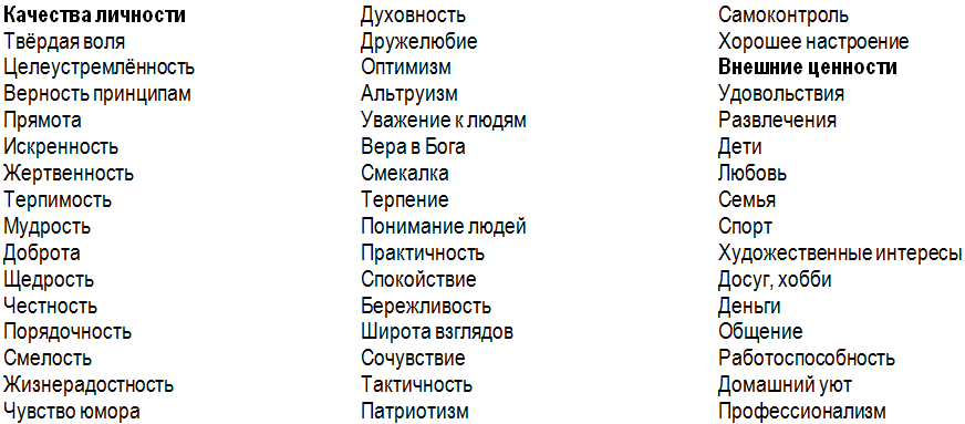 Из предложенного списка выберите, пожалуйста, от 5 до 7 ключевых ценностей вашей жизни. Если предложенного списка недостаточно, то придумайте свои.