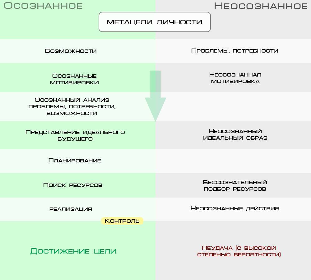 На рисунке выше хорошо видно, что отсутствие осознаваемой цели приводит к отсутствию этапа планирования, соответственно, поиск ресурсов для достижения неявной цели и соответствующие действия совершаются хаотично. Конечно, этот процесс не позволяет никак контролировать итоговый результат, а усилия, потраченные таким образом, будут напрасными.