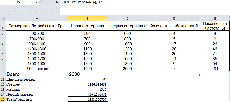 Рассчитаем третий квартиль. Используем следующую формулу =B7+B12*(D10*3/4-E6)/D7
