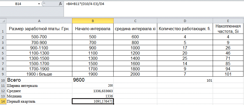 Рассчитаем первый дециль с помощью формулы =B3+B14*(D10/10-E2)/D3