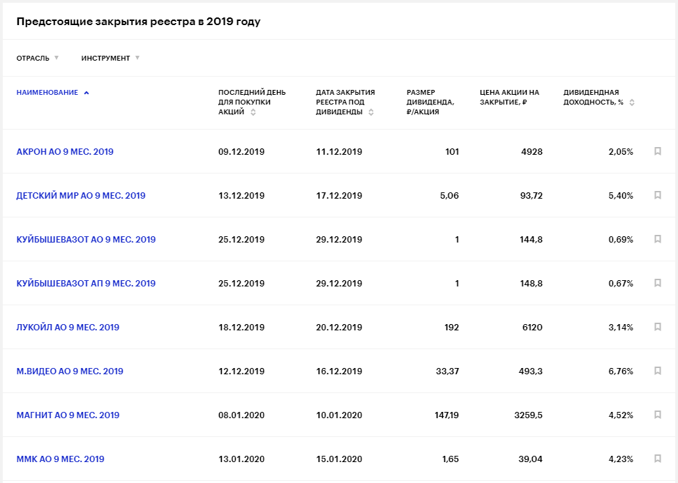 Ознакомиться со всеми предстоящими выплатами дивидендов по акциям компаний, а также сроки закрытия реестра можно очень много где – на сайте брокера, на популярных сервисах с котировками, например, Инвестинге — картинка выше. К тому же там обычно содержится информация и о том, как всё происходило в прошлом, сколько процентов от чистой прибыли компания направляла на дивиденды, как часто выплачивала, даты закрытия реестра и даты последних покупок акций, попадающих на выплату дивидендов. Вся эта информация может оказаться полезной, если инвестор ждёт выплаты.