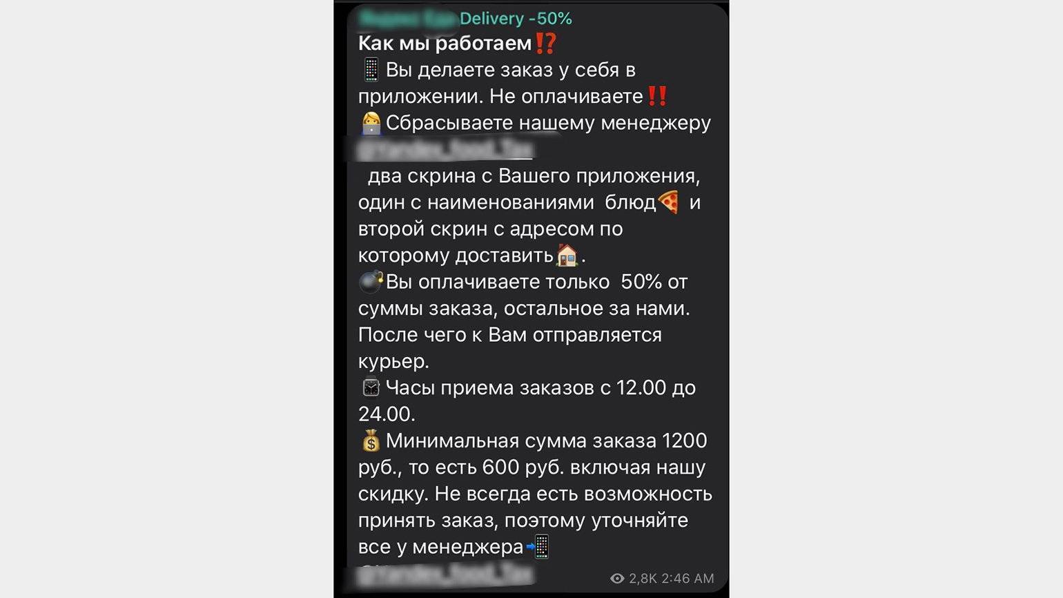 Пример кардерского «бизнеса» в сети — мошенники предлагают заказать еду или такси со скидкой 50%. Ничего удивительного: это единственный способ обналичить деньги со взломанного аккаунта.