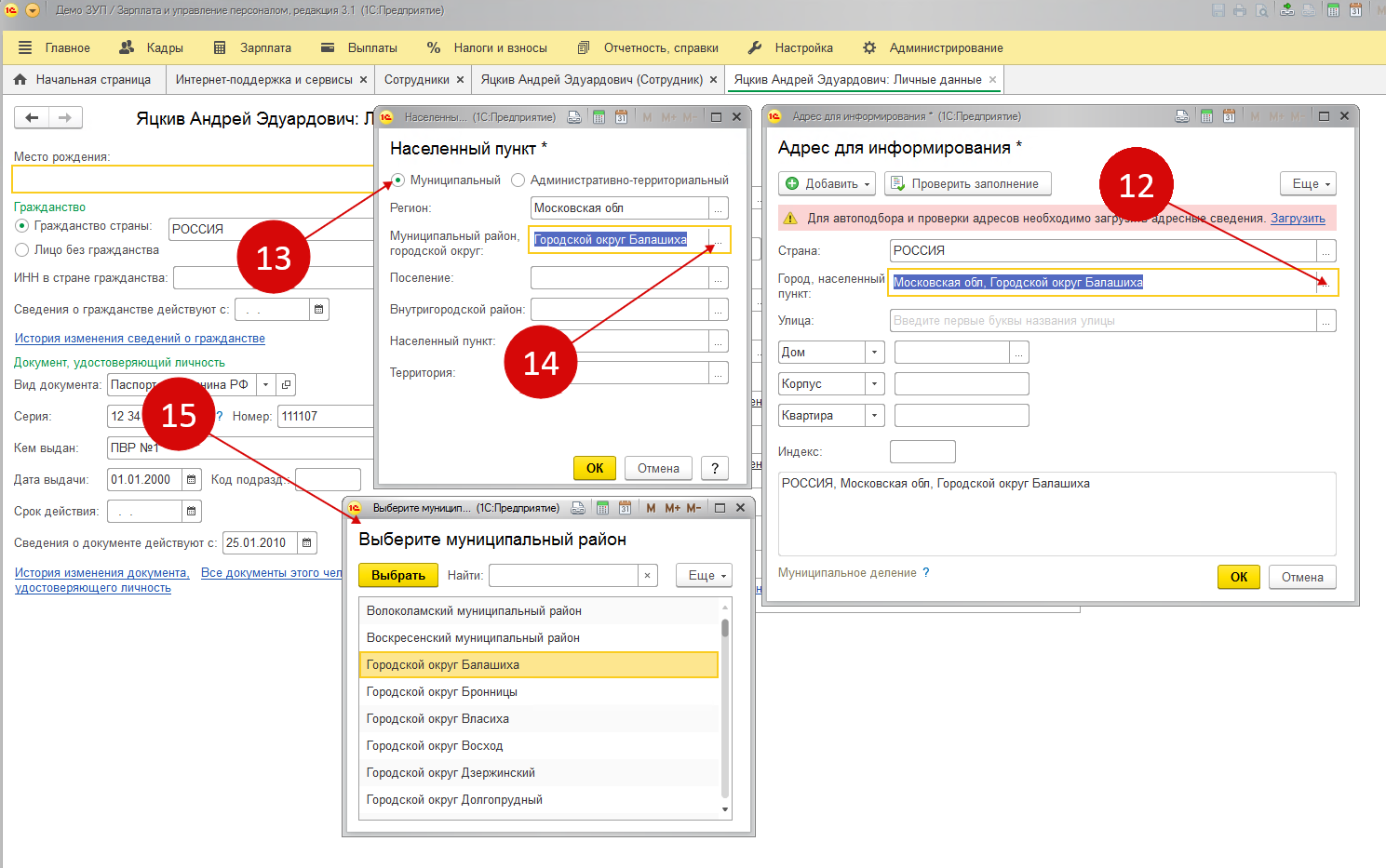 Проверить корректность работы загруженного адресного классификатора можно зайдя в любой из регистров, где есть адрес. Например, в «Адрес для информирования» в карточке работника. Для этого откройте окно во вкладке «Город, населенный пункт» (12). Из появившегося окна выберете муниципальный принцип деления (13), нажмите на справочник «Муниципальный район, городской округ» (14). Нажатием кнопки откроется справочник нужного муниципального района (15). Как только он откроется, вы поймете, что адресный классификатор ФИАС был корректно загружен.