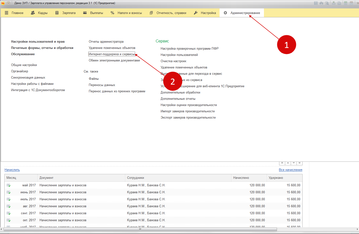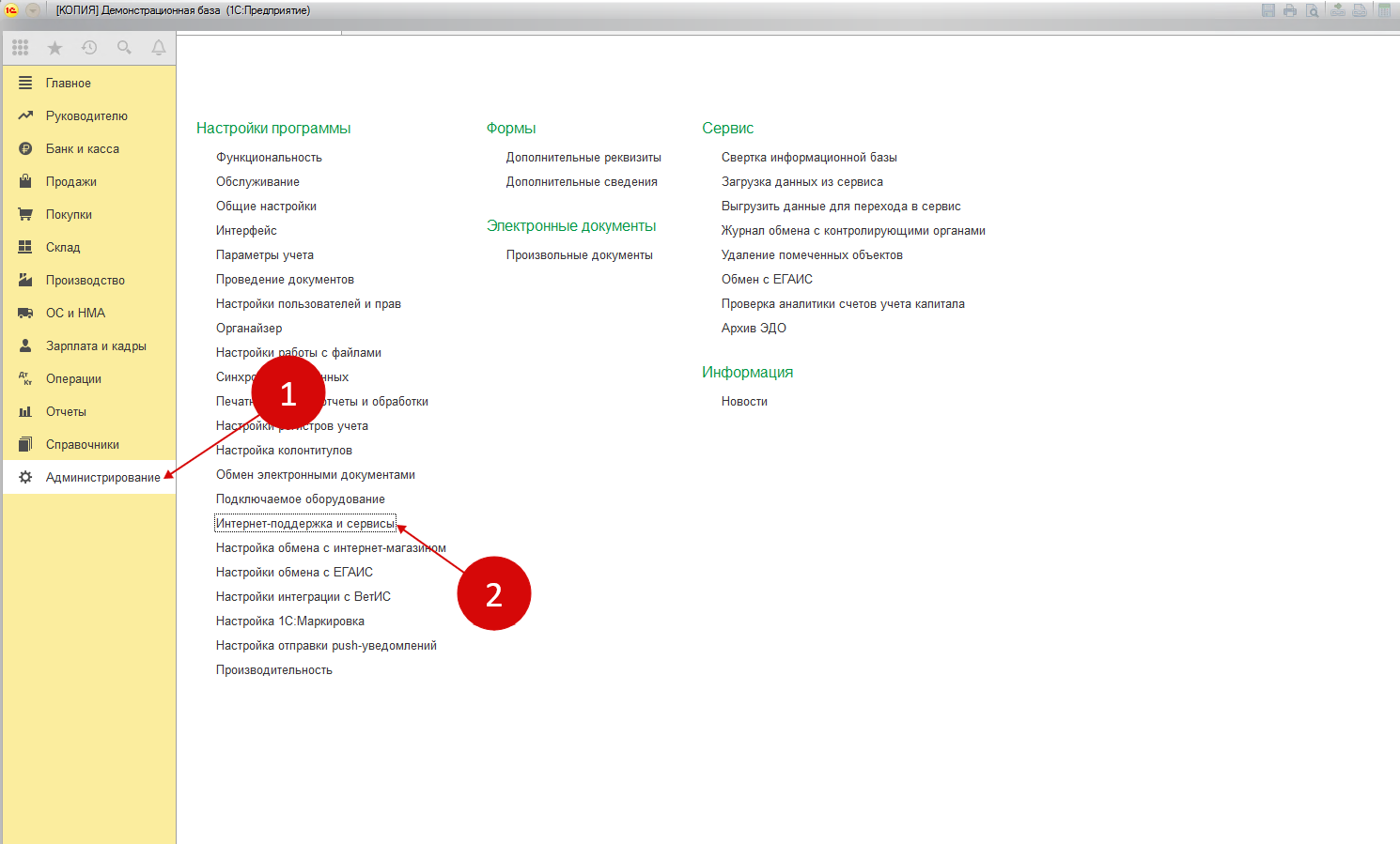 войти в раздел «Администрирование» (1) и открыть вкладку «Интернет-поддержка и сервисы» (2);