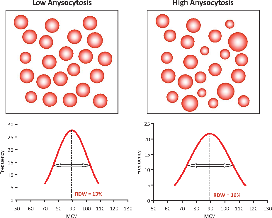 Анизоцитоз определяется показателем RDW и классифицируется согласно размерам эритроцитов вместе с MCV (средним объемом эритроцита):
