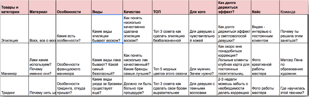 Это пример матрицы контента для салона красоты. Вы можете подставить любую услугу салона и найдёте адекватные вопросы, ответы на которые можно написать в теме этой услуги.