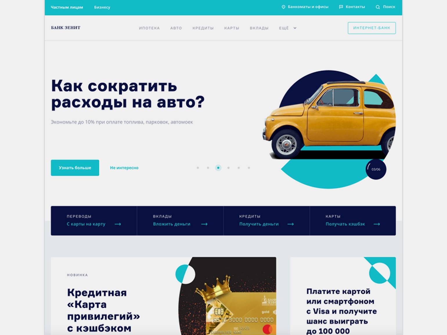 Оформление сайта банка «Зенит». Двухцветные круги — часть фирменного стиляИзображение: «Зенит» / дизайн компании AIC