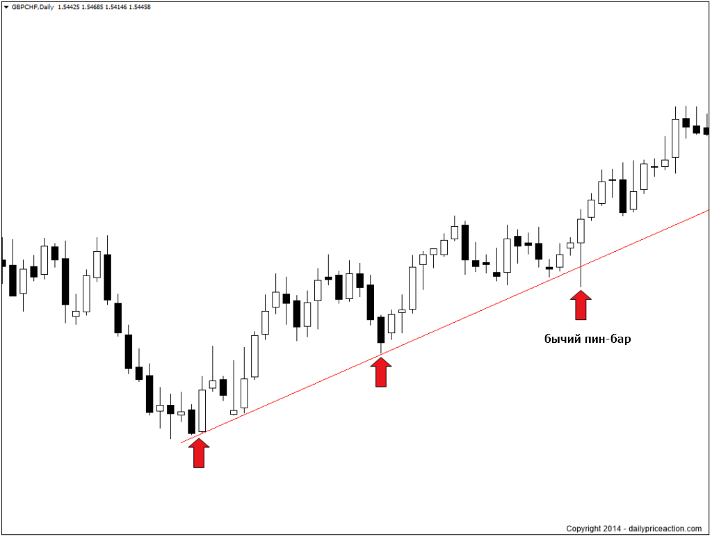 Обратите внимание, что у нас есть две основные точки на графике выше, через которые мы можем начать рисовать нашу линию тренда. Как только трендовая линия проведена, можно начинать искать возле нее сигналы на покупку, чтобы присоединиться к восходящему тренду. Действительно, несколько недель спустя, на линии тренда сформировался бычий пин-бар