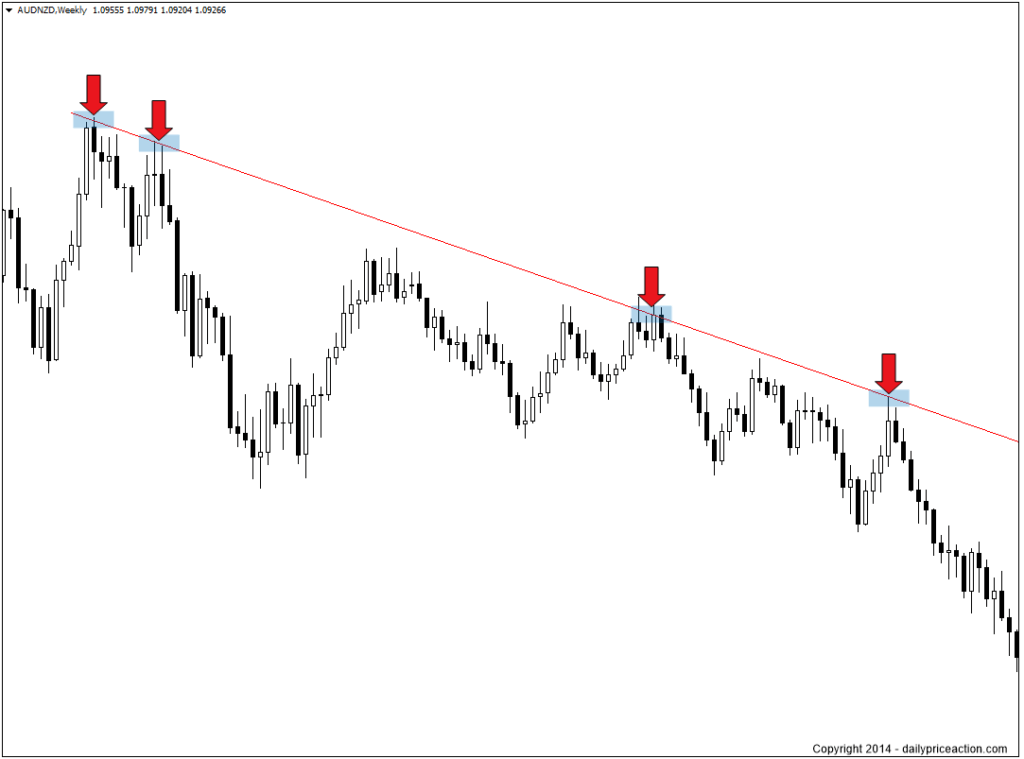 Сначала большинство трейдеров проведет линию, нарисованную здесь красным. Очевидно только, что эта линия нечасто сможет дать нам какой-либо прибыльный сигнал, поэтому проводите линии тренда, как только увидите, что она касается цены минимум три раза.