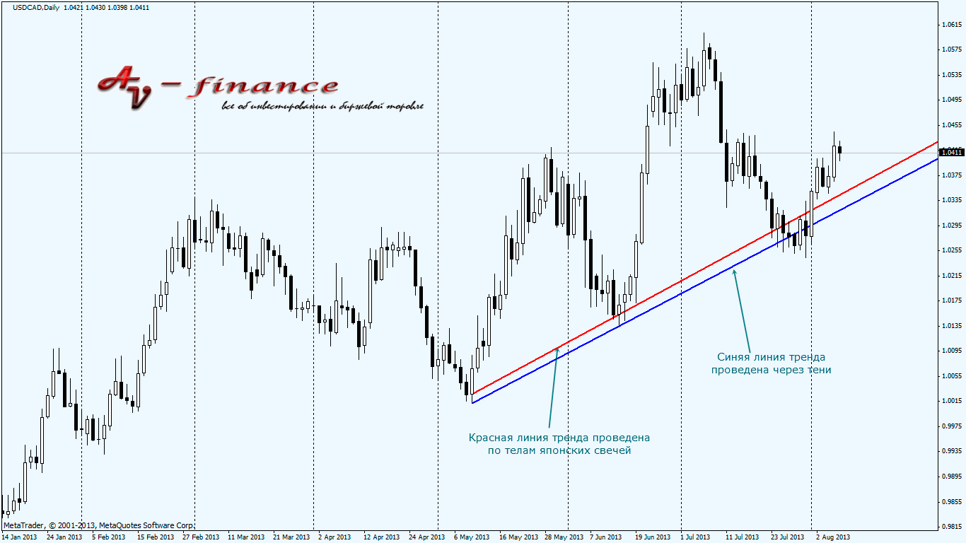 Как видно из вопроса, трендовую линию можно провести двумя способами: либо провести через тени (экстремумы), либо через уровни открытий и закрытий японских свечей. Вот как это будет выглядеть на графике: