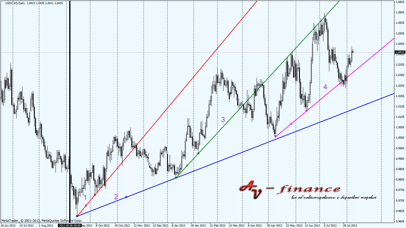 Точки для зеленой линии были выбраны также неслучайно: первая — это начало нового среднесрочного тренда от января 2013, а вторая — это минимум, появившейся после завершения первой коррекции. И четвертая — розовая трендовая линия проведена по аналогии с 3 линией. Точка отсчета — начало среднесрочного тренда от мая 2013 и вторая точка — минимум, образованный после первой коррекции.