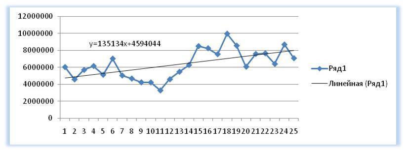 Выделяем анализируемый объём продаж и строим график, где по оси Х — наш временной ряд (1, 2, 3… — январь, февраль, март …), по оси У – объёмы продаж. Добавляем линию тренда и уравнение тренда на график. Получаем уравнение тренда y=135134x+4594044