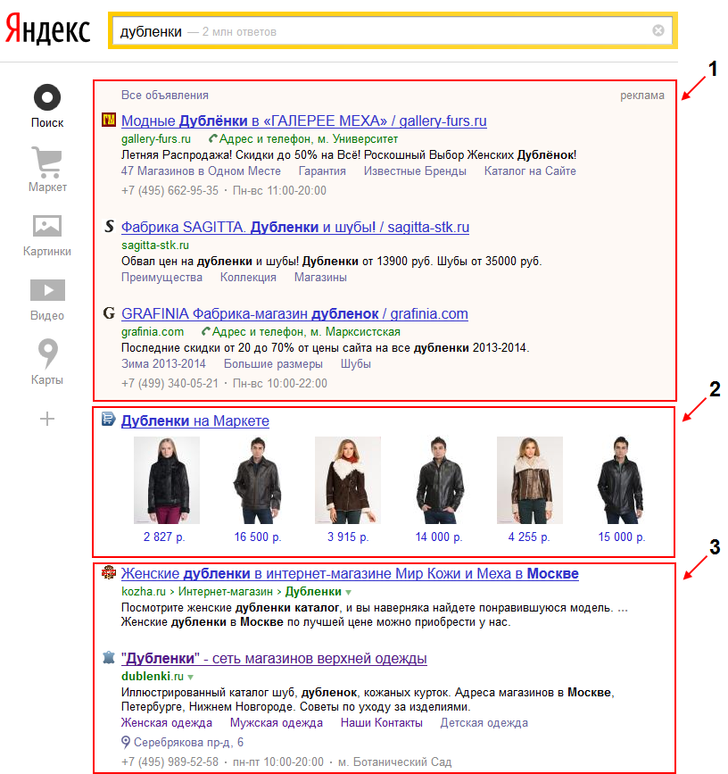 На Рис.3 представлен пример разделения естественных результатов выдачи (SEO) и рекламных результатов (контекстная реклама) в поисковике Яндекс, отдельно выделен специализированный результат — Яндекс.Маркет.
