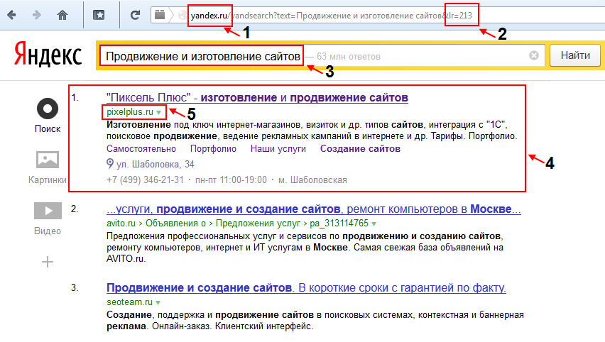 Рисунок 1: выдача поисковой системы Яндекс (1) в регионе Москва (2) по ключевому запросу (3). На первом месте в выдаче (4) фигурирует оптимизируемый сайт pixelplus.ru (5).