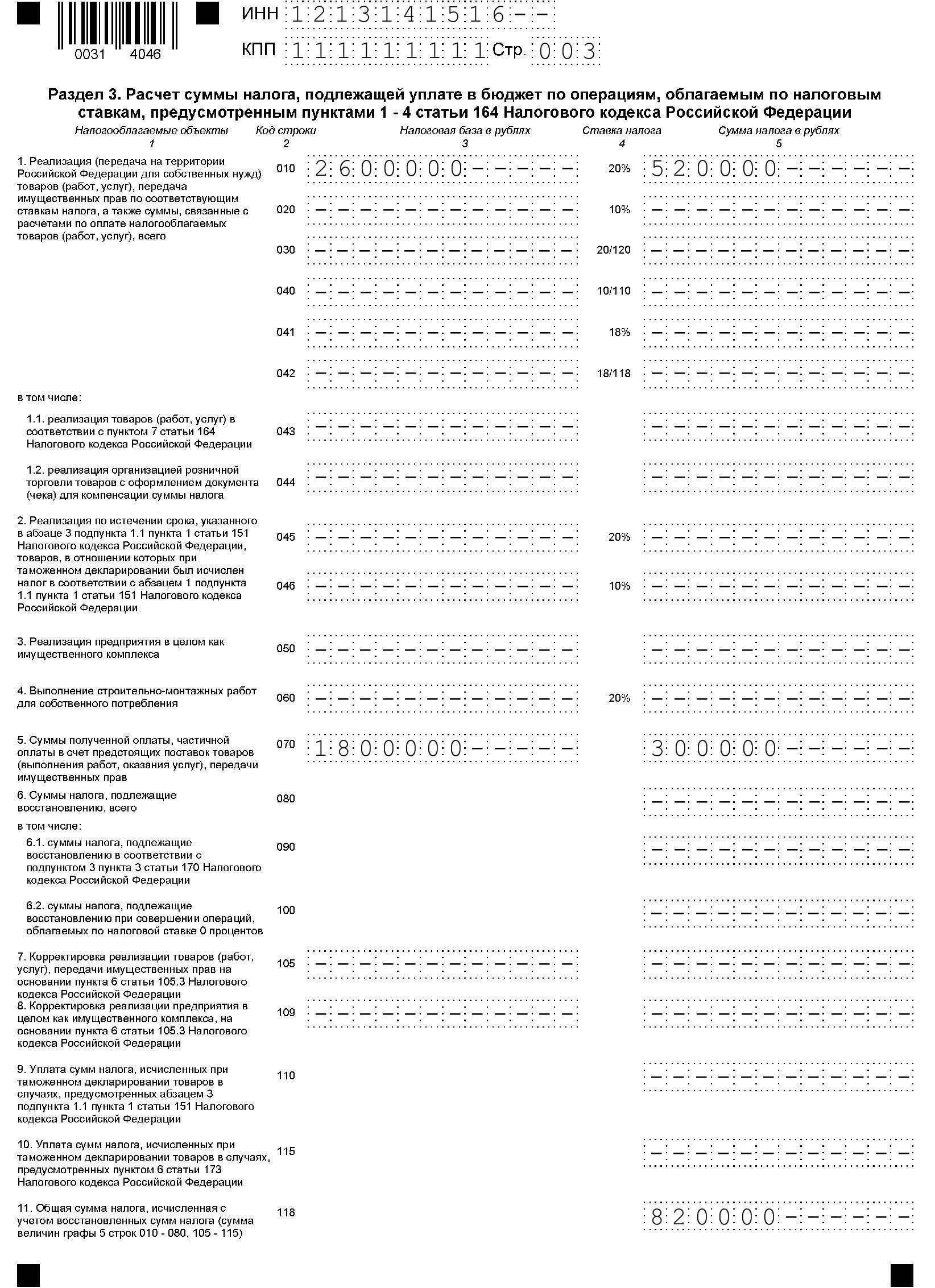 Раздел 3 — указывается расчёт суммы налога, который подлежит уплате, по операциям с 18% и 10% НДС.