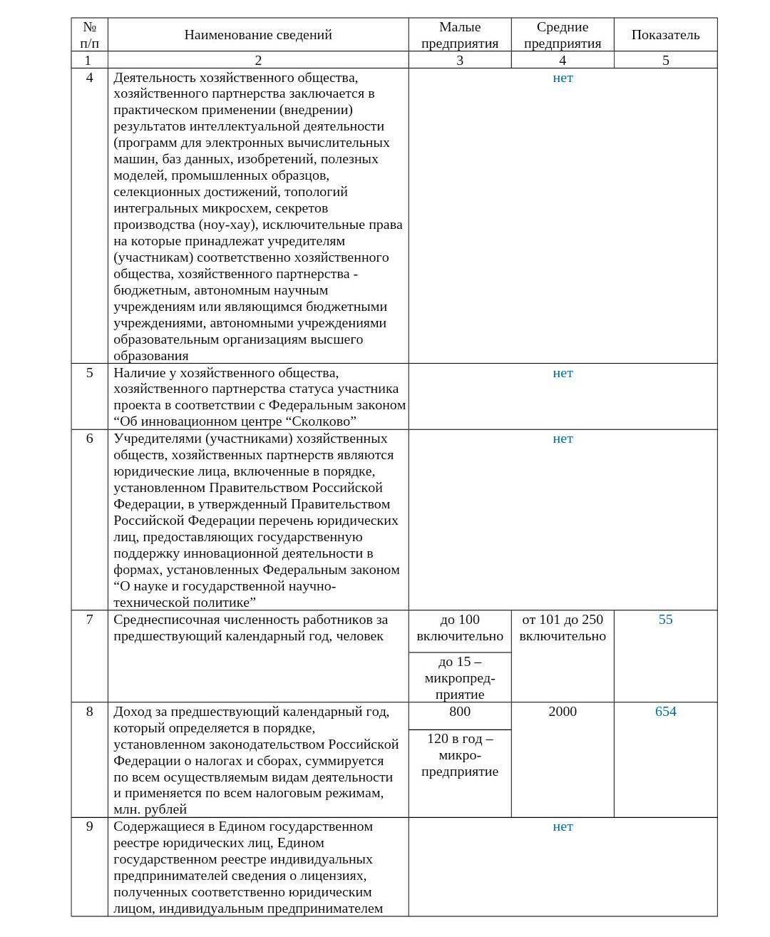 В пунктах 1 и 2 при соответствии указанным в них критериям в графе 5 проставляется «да» или «не превышает на момент заполнения». При желании в графе 5 можно указать фактический показатель. МСП, не являющиеся ООО, в указанных графах ставят прочерки.