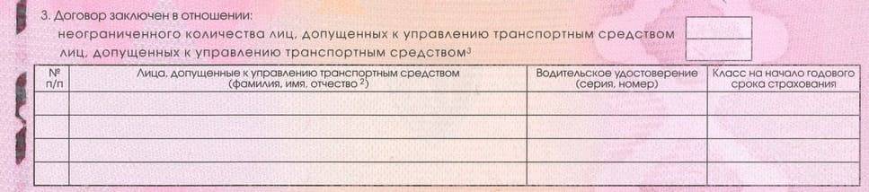 Если выше таблицы галочка прописана в первом поле, то можно управлять, не вписанным в страховку. Если же в нижнем поле (ограниченный круг лиц), то каждый из допущенных должен быть вписан в таблицу.