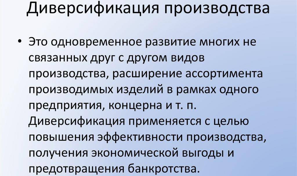 Диверсификация производства — это расширение активности крупных фирм, объединений, предприятий и целых отраслей за рамки основного бизнеса, под этим бизнесом понимается производство товаров и услуг, имеющих максимальные доли в объёме продаж по сравнению с другими видами продукции. Диверсификация — в широком смысле конечно же это стратегическая ориентация на создание многопрофильного производства.
