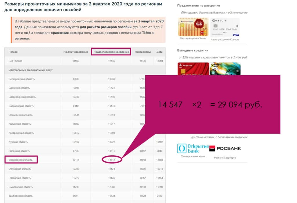 Возвращаемся к таблице с прожиточными минимумами, находим свой регион и смотрим столбец «трудоспособное население». Умножаем 14 547 на 2 и получаем 29 094 рубля.