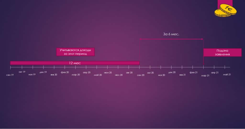 Итак, раз заявление мы подаём 1 марта, то доходы учитываются начиная с 1 сентября 2019 года и до 1 сентября 2020 года:
