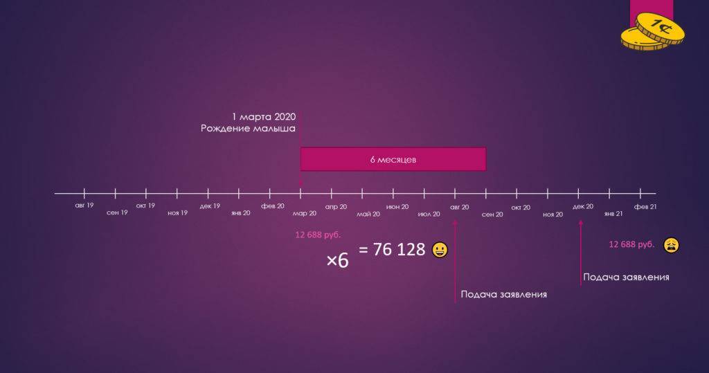Очень желательно сделать это в первые 6 месяцев после рождения ребёнка: если вы подадите заявление на 6 месяце жизни вашего малыша, то вы получаете пособие не только за текущий месяц, но и также за 5 предыдущих. В противном случае, если вы подаёте заявление в любой другой момент, вплоть до того, как ребенку исполнится 3 года, то и получать пособие вы будете с даты подачи заявления: