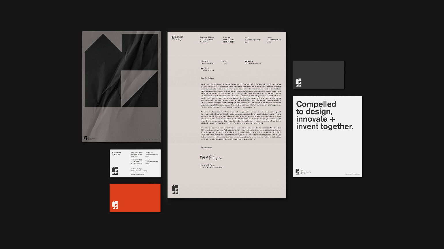 Палитра для фирменного стиля архитектурной студии — это оттенки серого, чёрный, белый и рыже-красный. Цвета бетона, гудрона, сигнальных лент и металлических конструкцийИзображение: Jordan Pearman / LEMONAPE Studio / Behance