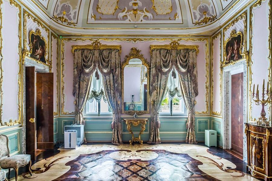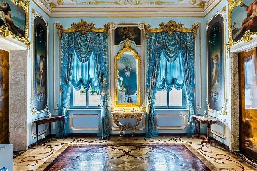Фантазия декораторов впечатляет: в оформлении дворцовых покоев штофные обои дополняет резьба по дереву, а живопись на холсте органично сочетается с росписью по штукатурке.