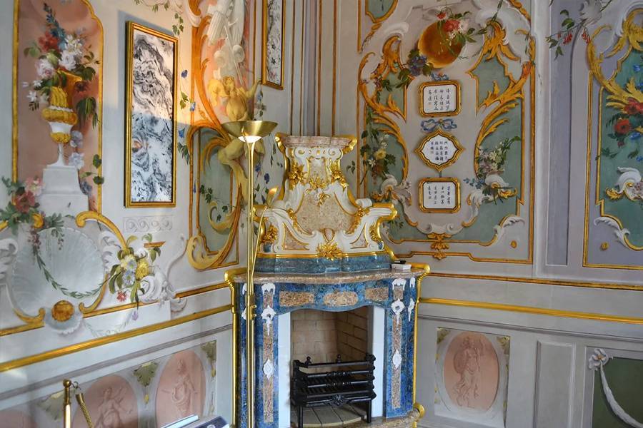 Изящная и рафинированная отделка комнат дворца переносит нас в чопорный XVIII век с его уходом от действительности в чарующий мир фантазий. Интерьеры Китайского дворца в Ораниенбауме поражают своим великолепием и гармонией материалов. Не зря свою летнюю дачу Екатерина называла “драгоценной безделушкой”.