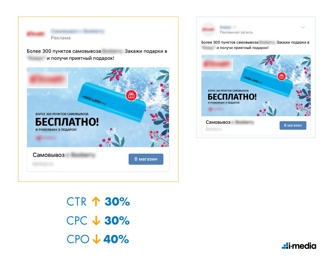 Для запуска карусели нужно подготовить как минимум три баннера, что делает этот формат весьма трудозатратным с точки зрения креативов. Однако усилия очень часто окупаются. Мы провели A/Б-тест карусели и баннера с кнопкой для крупного маркетплейса. При одинаковых вводных CTR карусели был на 35% выше, а CPC — на 13% выше. ДРР у карусели оказалась на 72% ниже, чем у баннера. И таких примеров успешного запуска каруселей в нашей практике довольно много.