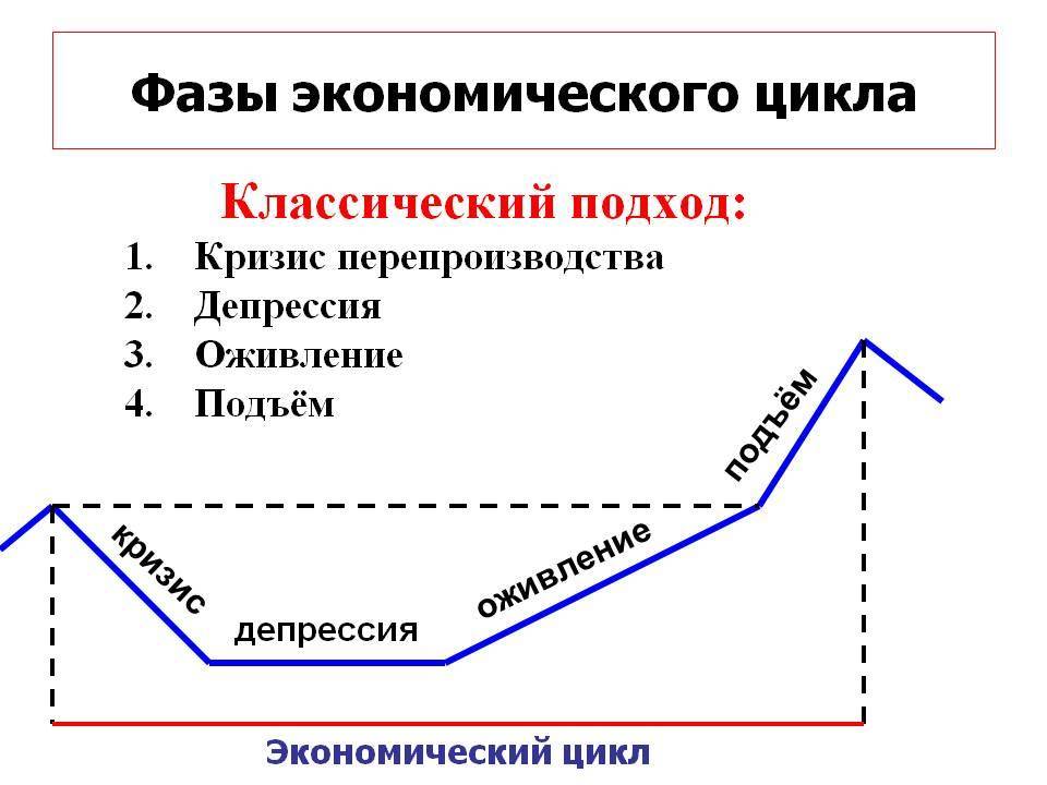 Экономика устроена так, что она может находится в одном из четырех фаз. При этом они могут иметь разные временные промежутки, но всегда следуют друг за другом. Смена фаз происходит периодически, но невозможно заранее спрогнозировать момент окончания каждой из них.