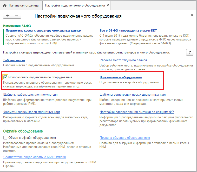 В разделе Настройки подключаемого оборудования (Администрирование – Подключаемое оборудование) нужно установить флажок Использовать подключаемое оборудование.