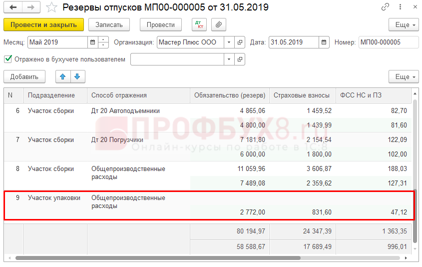 Проведем списание и начисление резерва отпусков в 1С 8.3 ЗУП за Май 2021.
