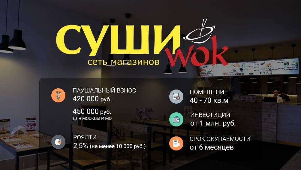 Суши Wok – это первая компания, применившая для суши формат «take-away» , который со временем приобрел большую популярность. Бренд Суши Вок известен по всей стране, открыты сотни магазинов. Несмотря на большое количество торговых точек, в некоторых городах существует отличная база для открытия: там отсутствует конкуренция и есть потребительский спрос.