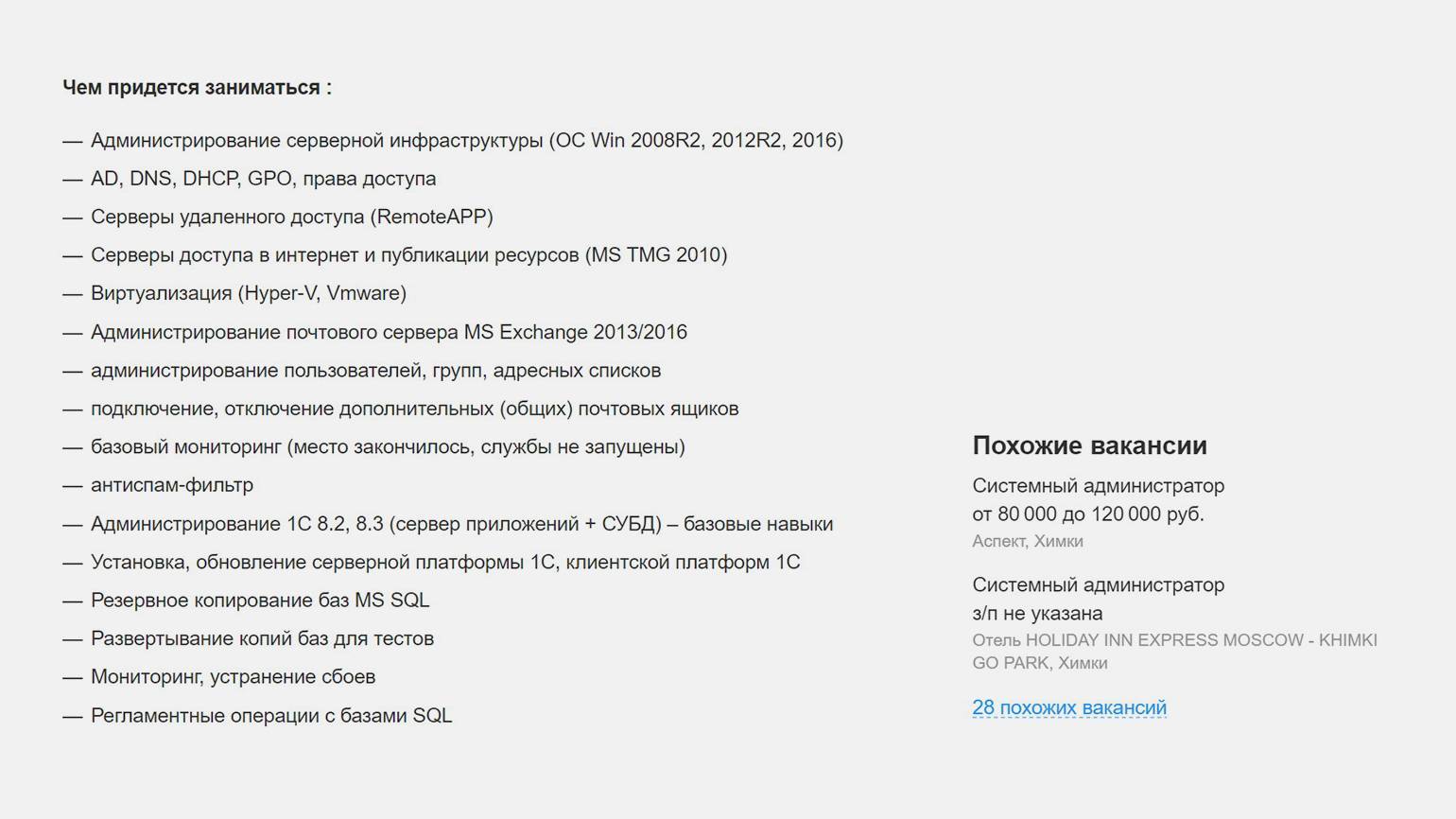 Рецепт простой: открываете вакансию «Системный администратор» на любом сайте по поиску работы и изучаете требования. Вот пример из первой попавшейся вакансии: