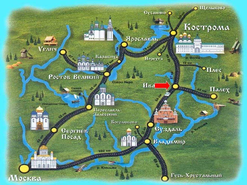 Москва — Гусь-Хрустальный — Муром — Гороховец — Палех — Плес — Кострома — Ярославль — Тутаев — Рыбинск — Углич — Калязин — Москва.