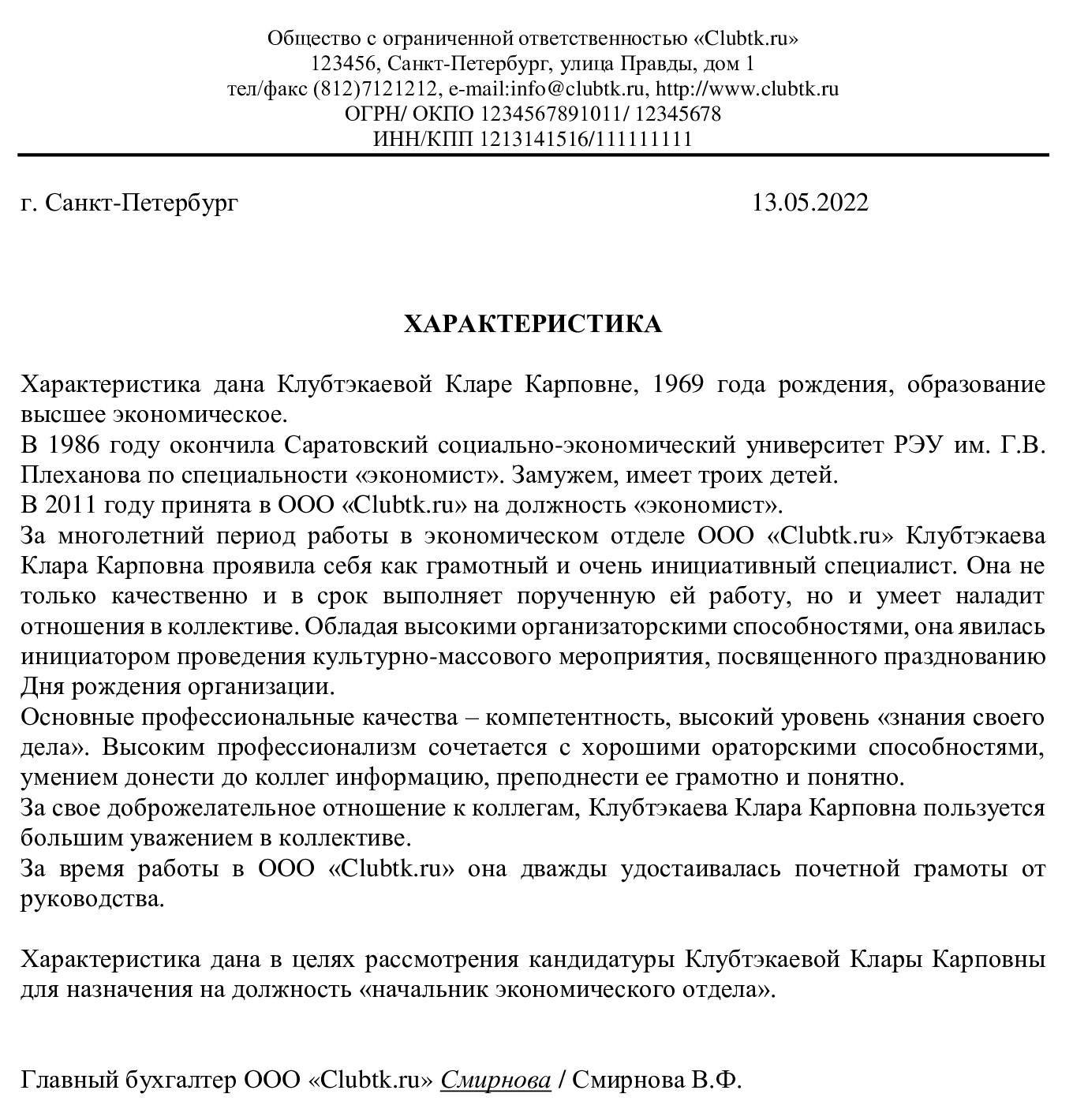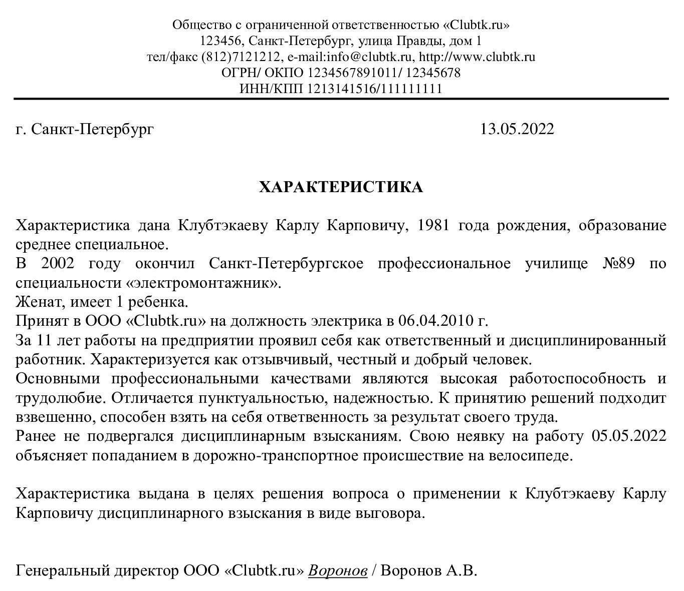 Образец характеристики с места работы, образец 2018
