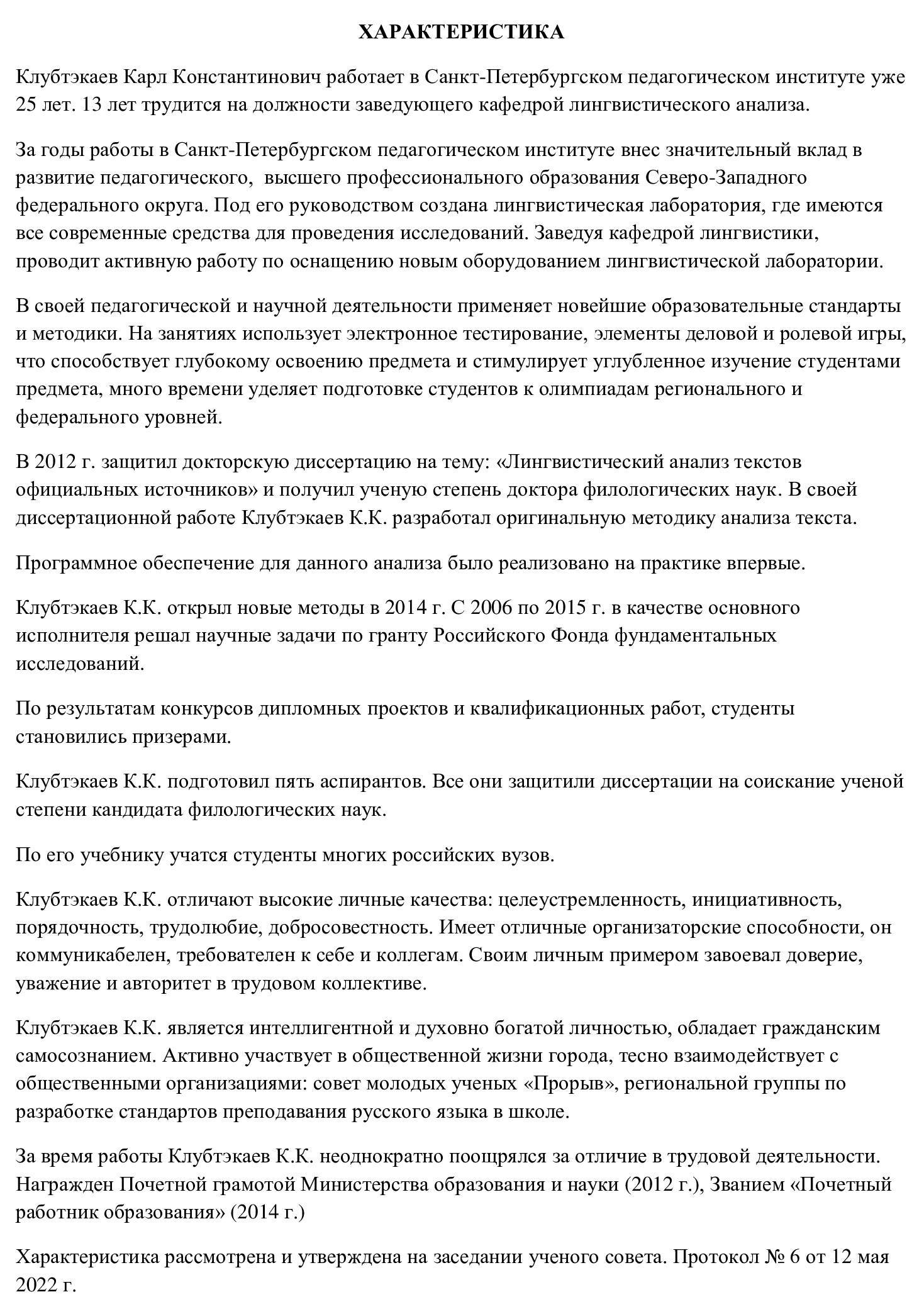 Вот пример характеристики для награждения почетной грамотой министерства: