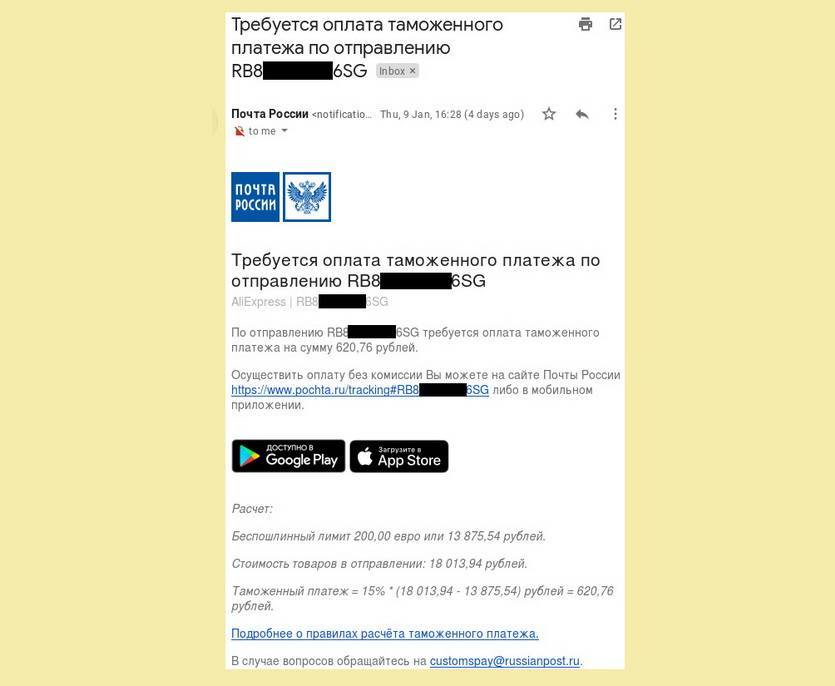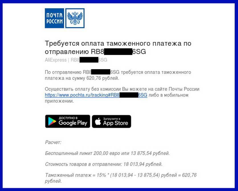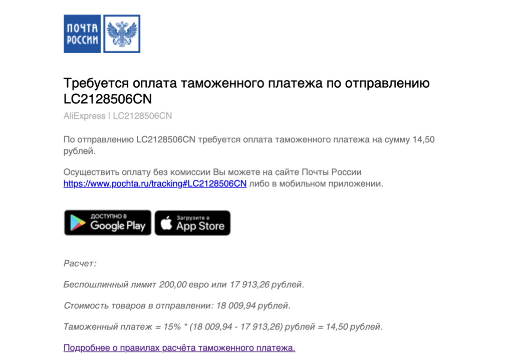 Начисленная пошлина оплачивается при получении посылки прямо в окне «Почты России», а так же через официальное приложение и сайт почтовой службы.