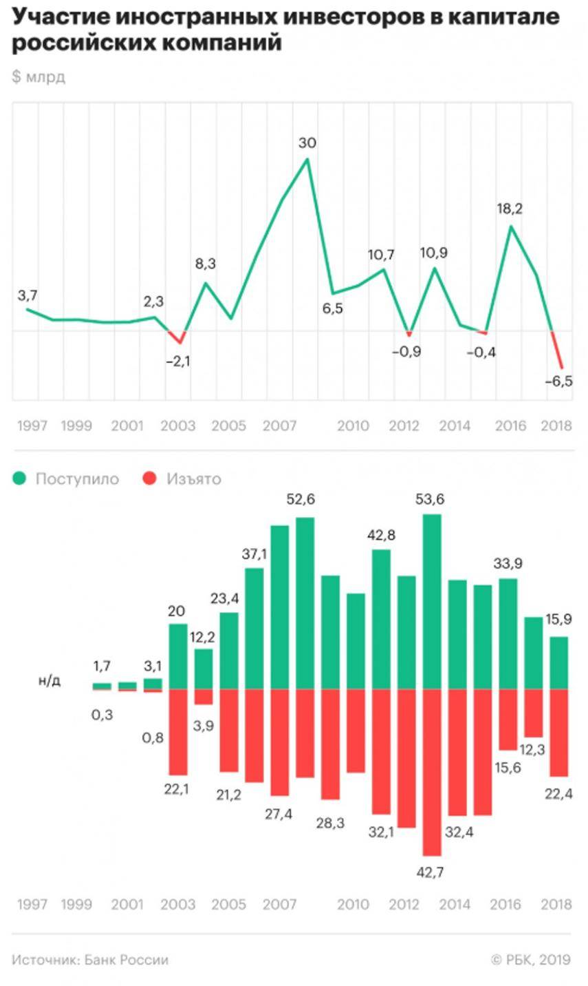 По итогам 2018 года сальдо отрицательное. Обусловлено высоким оттоком денег с рынка. Объем вложений нерезидентов в нефинансовый сектор (с реинвестированием) составил около $6 млрд. Минимальная цифра с 2002 года. Причина оттока — международные санкции. Необходимо учитывать факт отсутствия в статистике ЦБ отдельной статьи по инвестициям офшоров российских компаний.